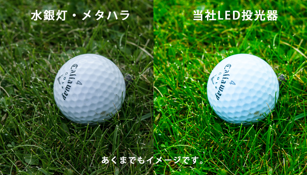 - LED投光器1灯で太陽光に近い色(5000K)に暖色系の光を混ぜることでボールや芝が見えやすくなり、快適なプレーが可能になります。