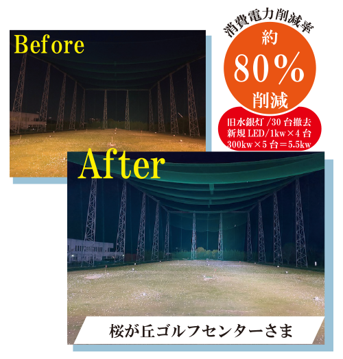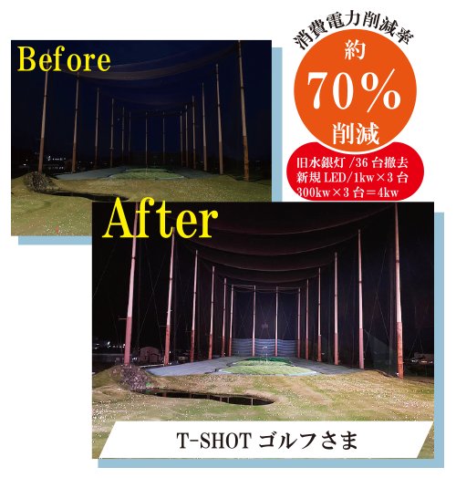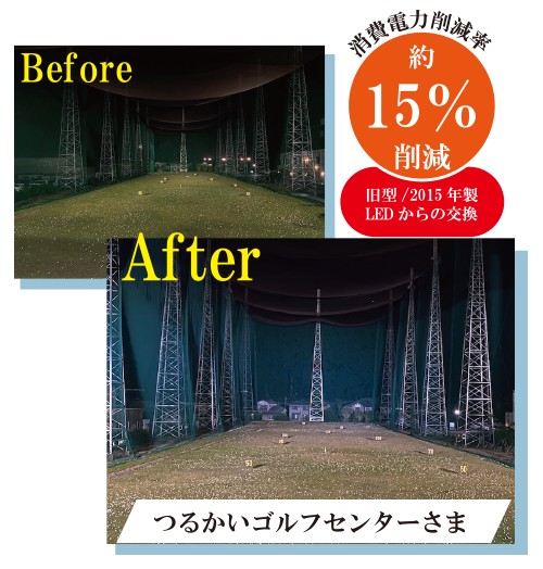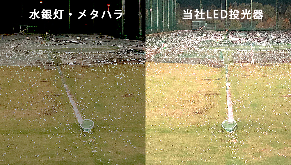 ナイターの利用者も多いゴルフ練習場では、照明のランニングコストを抑えると同時に、ゴルフボールがはっきり見える照明が必要です。