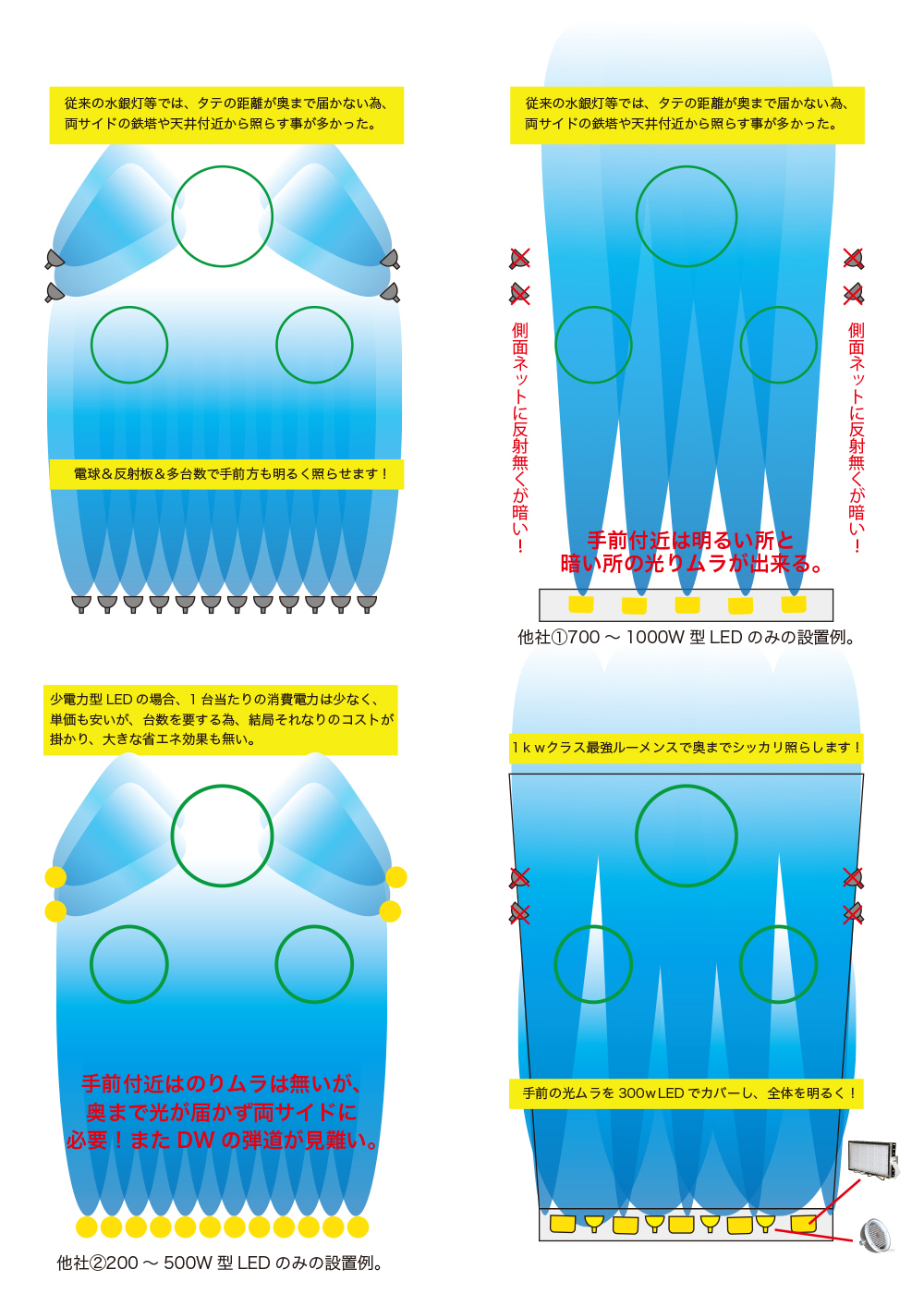 また、夜間道路を走っている車にゴルフ練習場の存在を照明で明確にアピールすることも必要です。