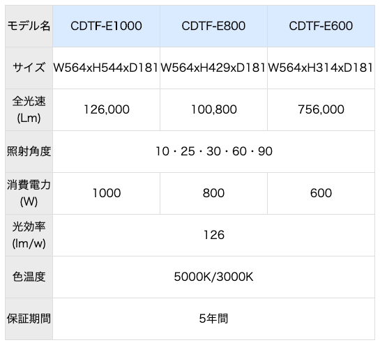 | モデル名 | CDTF-E1000 | CDTF-E800 | CDTF-E600 |