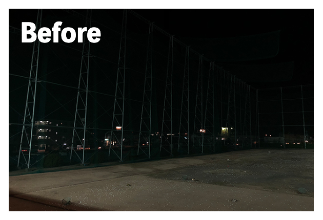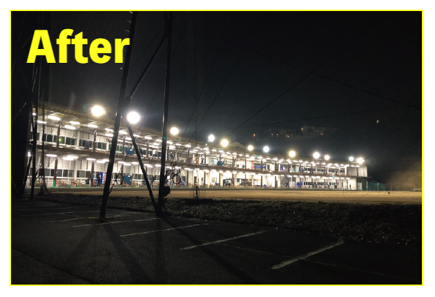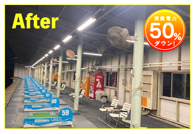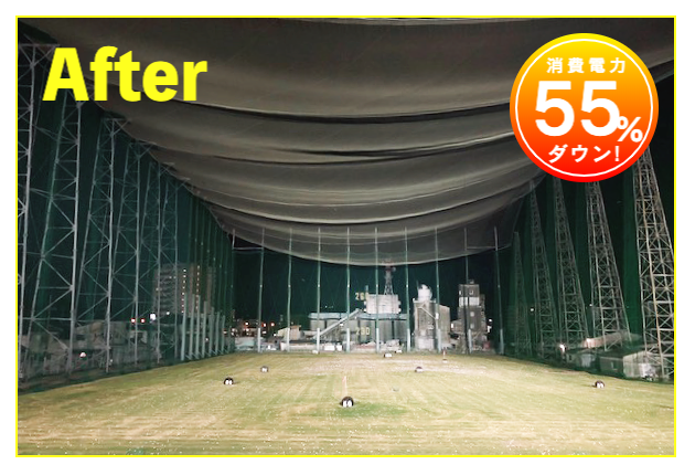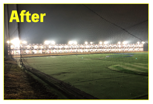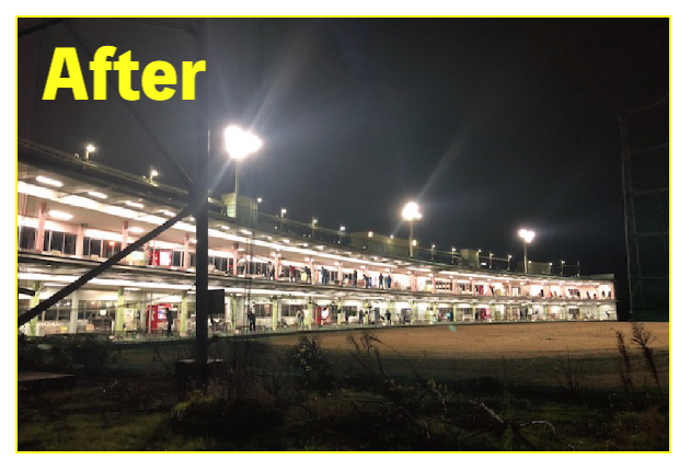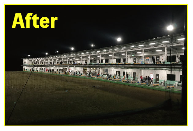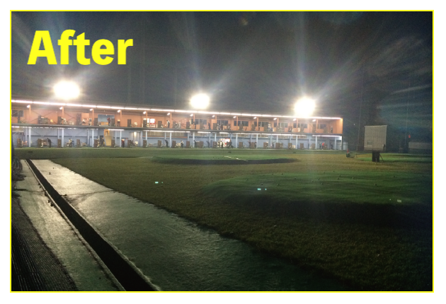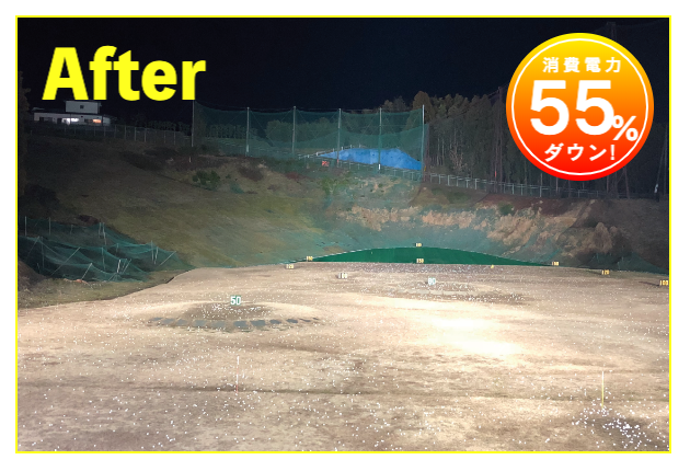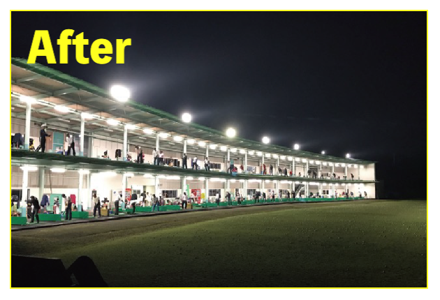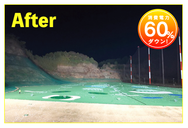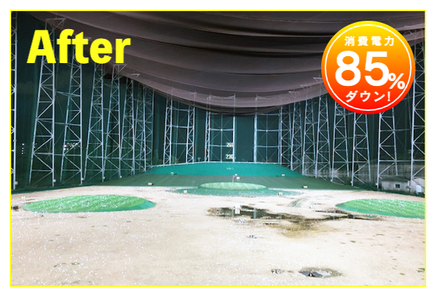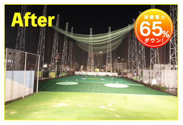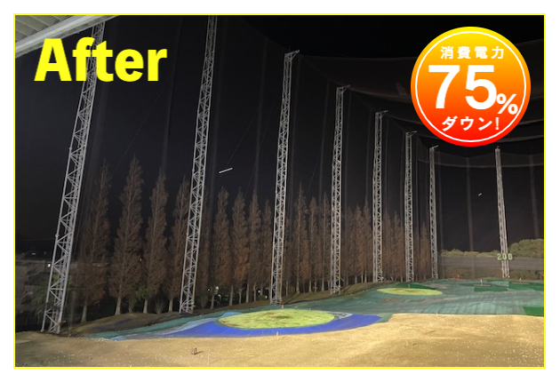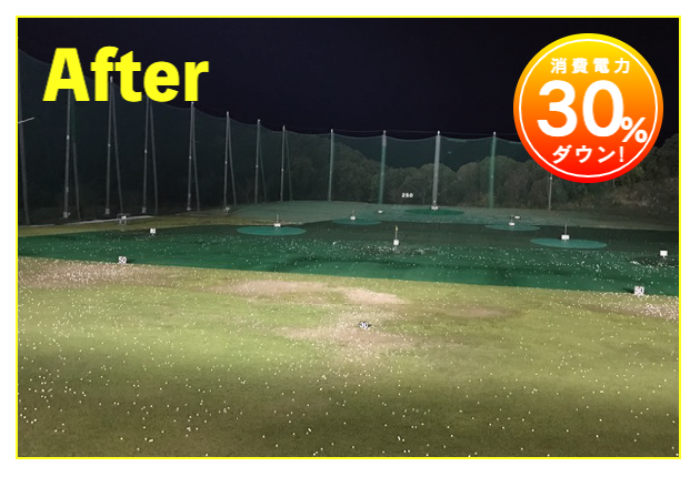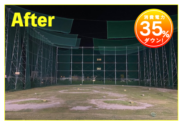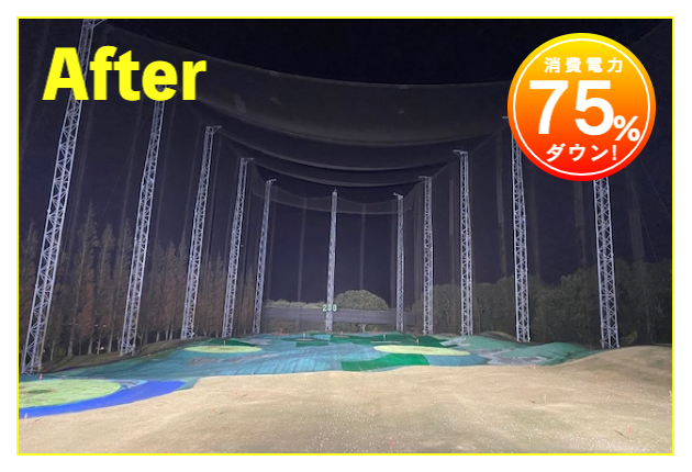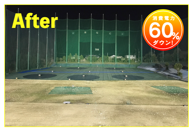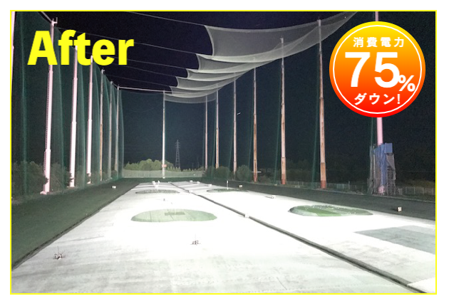 LED照明施工事例② LED Lighting LED照明・ナイター照明 LED照明 施工事例① 16件掲載 LED照明 施工事例② 15件掲載 LED照明 施工事例③ 6件掲載 電力消費量を大幅に削減し、見え方も改善。多くの実績と経験を元に、施設に最適な照明のご提案を致します。 WORKS-2 導入事例-2 前原ファミリーゴルフ様 -福岡県糸島市- LEDナイター照明設置交換工事 導入前 メタルハライド2kw×8台消費電力=約16Kw LED導入後 1kw×3台 500w×1台 300w×1台=約4.1Kw消費電力=マイナス約12Kw 75%削減 曙ゴルフガーデン様 -福岡県筑紫野市- LEDナイター照明設置交換工事 扇風機も交換いたしました 導入前 LG電子製プラズマライティングシステム 1Kw10台消費電力=10Kw LED導入後 当社LED1Kw 5台+300W 5台+300w 5台消費電力=6.5Kwマイナス3.5KW/35%削減。 駐車場も水銀灯からLED150Wに交換 2F打席の蛍光灯からベースライト型LEDに交換 導入前 蛍光灯35w 59台消費電力 約2.0Kw LED導入後 LED16w 59台消費電力 約0.9Kwマイナス1.0Kw 50%削減 博多金の隈ゴルフヒルズ様 -福岡市博多区- 300ヤードオーバー! 導入前 メタルハライド1kw×28台消費電力=約30Kw LED導入後 1kw×9台 300w×8台消費電力=約12.5Kw ゴルフウエスポ様 -福岡県北九州市- 24時間営業! 導入前 メタルハライド2kw×16台消費電力=約33Kw LED導入後 1kw×5台 300w×4台消費電力=約5.5Kw 十條ゴルフガーデン様 -福岡県北九州市- 特徴:中角(20°)3台のみ 導入前 メタルハライド2kw×6台消費電力=約12Kw LED導入後 1kw×3台 300w×3台消費電力=約4.2Kw ゴルフパーク スイング様 中角(20°)3台のみ 導入前 水銀灯1kw×16台消費電力=約16Kw LED導入後 1kw×3台 300w×3台消費電力=約4.2Kw マリゼ春日浦ゴルフスクエア様 -{}大分県大分市- 場外パターコーナーもLED化 導入前 メタルハライド1kw×3台メタルハライド2kw×6台消費電力=約15Kw LED導入後 1kw×5台 300w×5台消費電力=約6.5Kw セイコウゴルフガーデン様 -福岡県福津市- 省エネ補助金交付店 導入前 メタルハライド1kw×1台メタルハライド500w×22台消費電力=約12Kw LED導入後 1kw×3台 300w×4台消費電力=約4.2Kw ベストゴルフ チクホ様 -福岡県宮若市- 駐車場、バンカーもLED化POSレジシステムも導入! 導入前 メタルハライド2kw×7台消費電力=約14Kw LED導入後 1kw×4台 300w×5台消費電力=約5.5Kw エースゴルフ様 -長崎県北松浦郡佐々町- 故障もなくなり安心! 導入前 LG電子PLS 1kw×9台消費電力=約9Kw LED導入後 1kw×5台 300w×4台消費電力=約6.2Kw ヨリモゴルフ倶楽部様 -大分県宇佐市- 駐車場LED化完了! 導入前 水銀灯 1kw×12台消費電力=約12Kw LED導入後 1kw×2台 300w×4台消費電力=約3.2Kw サンバレーゴルフプラザ様 -熊本県熊本市- 駐車場も明るくなりました。 導入前 水銀灯 1kw×22台メタルハライド 2kw×5台消費電力=約32Kw LED導入後 1kw×3台 300w×4台メタルハライド 2kw×5台消費電力=約14.2Kw 桜が丘ゴルフセンター様 -福岡県飯塚市- パターコーナーへのLED照明設置 導入前 700W水銀灯×4台 LED導入後 300wLED×2台150W×1台 十條ゴルフ様 -福岡県北九州市- 壁面看板用150W照明を2台設置 夜間デンモンストレーション承ります。見れば納得の明るさを体感できます。 HOME お知らせ一覧 取扱商品一覧 広告募集! お手軽価格シュミレーター スイング分析特化型シュミレーター 左パーテーション LED照明・ナイター照明 -LED照明 施工事例① -LED照明 施工事例② -LED照明 施工事例③ POSレジシステム ティーアップ機 ボールホッパー 打席改修 トルネード型ボール洗浄機 左打席増設 オリジナル仕切版 送球システム タイルカーペット・床材 フェアウェイ人工芝 防球ネット各種 ボール集球機各種 打席チェア 鉄塔診断 スイングナビ 暖房機器 ハスクバーナロボット芝刈機 場内・ヤード版・備品 アプローチポッド オリジナルマット固定ゴム その他・備品各種 会社概要